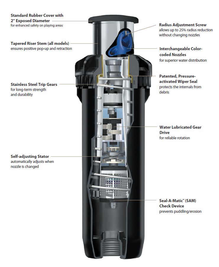Tandwiel gedreven sectorsproeiers Pop-Up 10 cm, toepasbaar in middelgrote en grote tuinen- terreinen, parken, sportvelden.[/br]