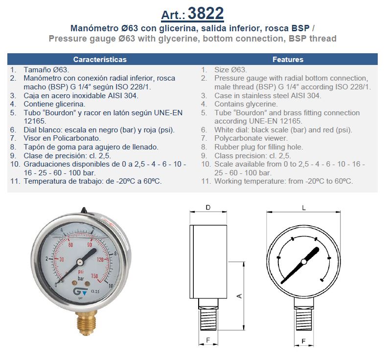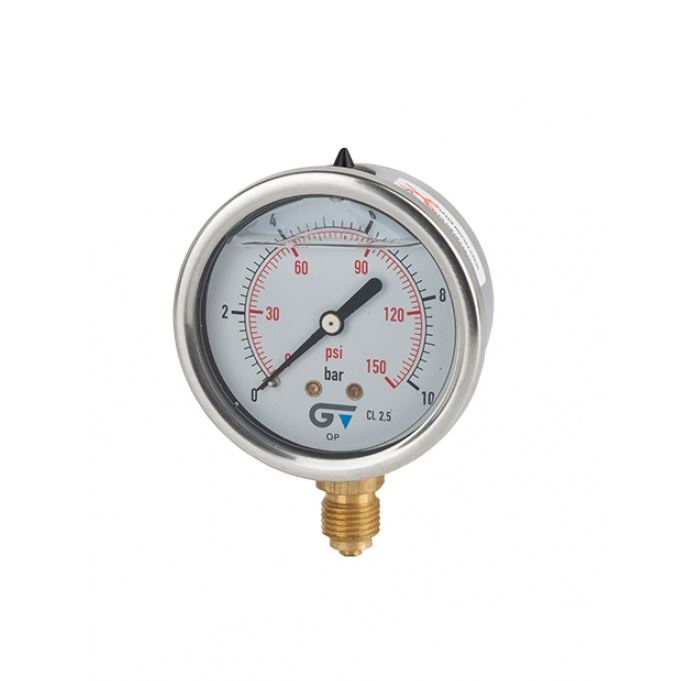 Manometer, RVS 304 behuizing, glycerine gevuld, diam. 63 mm, type 7211, 1/4" messing bu.dr. 0 - 40 bar, onderaansluiting