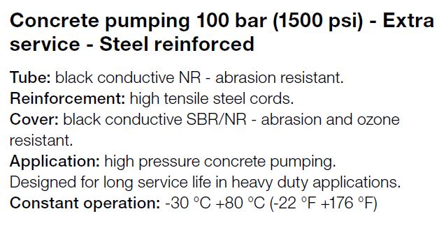 | Toepassing | Hoge druk beton persslang.100 bar. Speciaal ontworpen voor lange levensduur tijdens zware toepassingen |