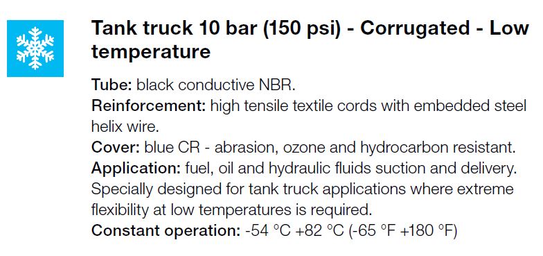 | Toepassing | Zuig -en persslang voor` brandstof, olie en hydraulische vloeistoffen. Speciaal ontworpen voor tankwagentoepassingen waar extreme flexibiliteit bij lage temperaturen vereist is. |