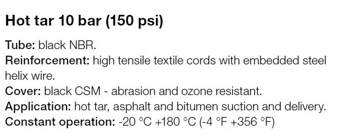 | Toepassing | Zuig -en persslang voor hete teer, asfalt en bitumen |