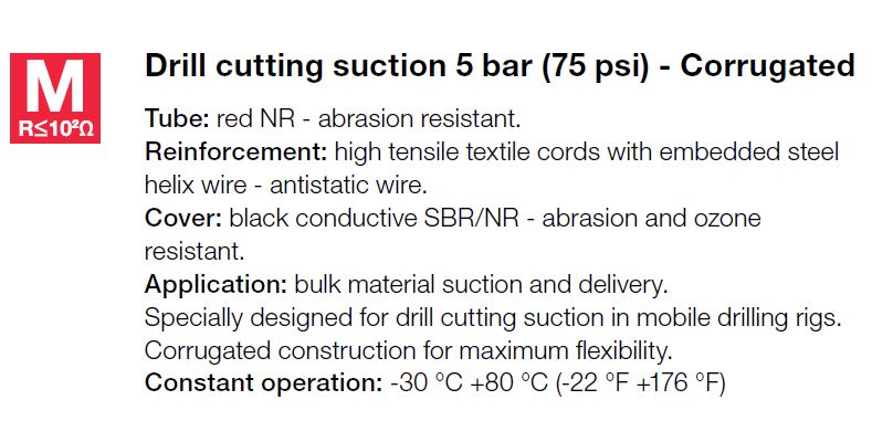 | Toepassing | Bulkmateriaal, zuig en persslang . Specifiek ontvorpen voor 'drill cutting suction in mobile drilling rigs. |