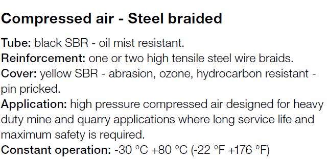 | Toepassing | Hoge druk persluchttoepassingen specifiek voor mijn en groeve toepassingen waar maximale veiligheid en levensduur een vereiste is |