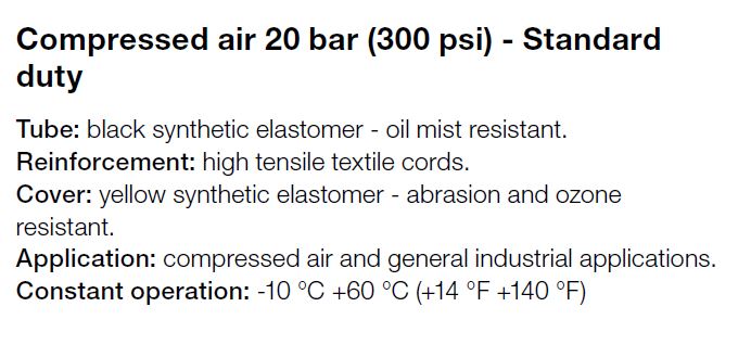 | Buitenwand (slang) | Geel, synthtisch elastomeer, slijtvast en ozonbestendig |